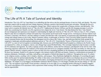 "The Life of Pi" by Yann Martel is an enthralling tale that delves into the profound themes of survival, faith, and identity. The story captivates readers with its unique plot and vibrant characters, offering a narrative that extends beyond mere adventure. Through the lens of a young boy's extraordinary journey at sea alongside a Bengal tiger, Martel explores the complexities of human existence and spirituality. This essay seeks to examine the intricate layers of "The Life of Pi," emphasizing its literary brilliance and the life-changing messages it conveys, while also considering how Martel's own life experiences have shaped the novel.