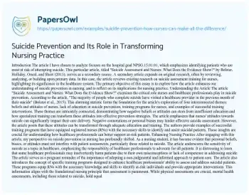 Suicide Prevention and Its Role in Transforming Nursing Practice. (2022, Apr 17). Retrieved from https://hub.papersowl.com/examples/suicide-prevention-how-nurses-can-make-all-the-difference/