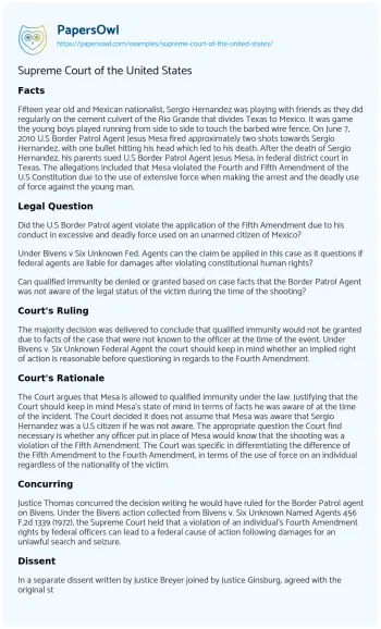 The Court argues that Mesa is allowed to qualified immunity under the law. Justifying that the Court should keep in mind Mesa's state of mind in terms of facts he was aware of at the time of the incident. The Court decided it does not assume that Mesa was aware that Sergio Hernandez was a U.S citizen if he was not aware. The appropriate question the Court find necessary is whether any officer put in place of Mesa would know that the shooting was a violation of the Fifth Amendment. The Court was specific in differentiating the difference of the Fifth Amendment to the Fourth Amendment, in terms of the use of force on an individual regardless of the nationality of the victim.