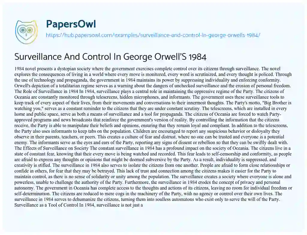 Surveillance And Control In George Orwell'S 1984. (2025, Jul 23). Retrieved from https://hub.papersowl.com/examples/surveillance-and-control-in-george-orwells-1984/
