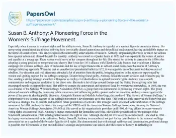 Susan B. Anthony: A Pioneering Force in the Women's Suffrage Movement. (2024, May 12). Retrieved from https://hub.papersowl.com/examples/susan-b-anthony-a-pioneering-force-in-the-womens-suffrage-movement/