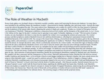 This essay will delve into the symbolism of weather in Shakespeare’s “Macbeth.” It will explore how elements like storms, fog, and darkness mirror the play’s themes of chaos, ambition, and guilt. The piece will analyze how Shakespeare uses weather to enhance the mood and foreshadow events. At PapersOwl too, you can discover numerous free essay illustrations related to Macbeth.