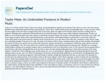 Taylor Meier: An Undeniable Presence in Modern Music. (2023, Oct 16). Retrieved from https://hub.papersowl.com/examples/taylor-meier-an-undeniable-presence-in-modern-music/