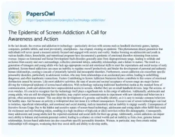 The Epidemic of Screen Addiction: A Call for Awareness and Action. (2021, May 11). Retrieved from https://hub.papersowl.com/examples/technology-addiction/