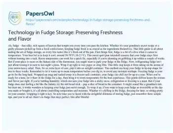 This essay delves into the innovative techniques of storing fudge, blending traditional methods with modern technology to preserve its freshness and flavor. It begins by identifying the ideal temperature range for fudge storage, emphasizing the importance of keeping it in a cool environment, whether at room temperature for short-term enjoyment or in the refrigerator for longer preservation. The essay highlights the significance of precise wrapping using wax paper or plastic wrap to protect the fudge from absorbing unwanted fridge odors and moisture. For long-term storage, it suggests freezing the fudge, detailing the process of wrapping and thawing to maintain its quality. Additionally, it addresses the challenges of humidity and offers a simple, yet effective solution to rehydrate drying fudge. By combining these storage strategies with insights on temperature and moisture management, the essay presents a comprehensive guide for keeping fudge at its best, ensuring every bite remains as indulgent as the first. Additionally, PapersOwl presents more free essays samples linked to Technology.