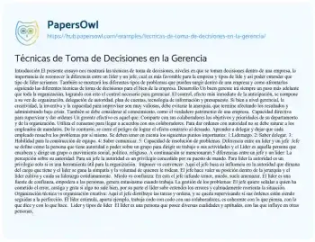 El presente ensayo nos mostrará las técnicas de toma de decisiones, niveles en que se toman decisiones dentro de una empresa, la importancia de reconocer la diferencia entre un líder y un jefe, cual es más favorable para la empresa y tipos de líde y así poder entender que tipo de líder seriamos. También se mostrará los diferentes tipos de problemas que pueden surgir dentro de una empresa y como afrontarlos siguiendo las diferentes técnicas de toma de decisiones para el bien de la empresa.