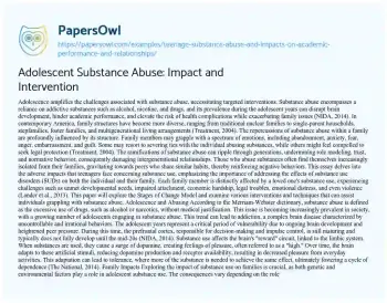 Adolescent Substance Abuse: Impact and Intervention. (2021, May 22). Retrieved from https://hub.papersowl.com/examples/teenage-substance-abuse-and-impacts-on-academic-performance-and-relationships/