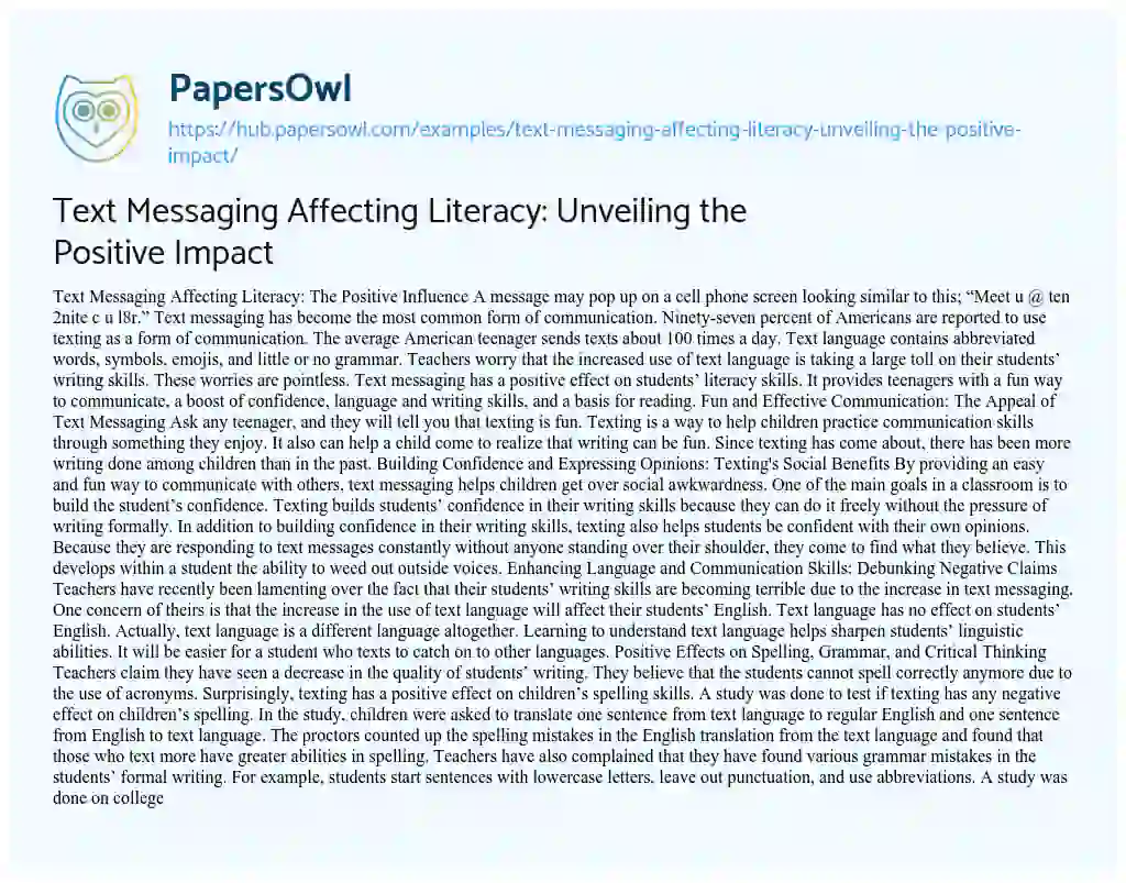 Text Messaging Affecting Literacy: Unveiling the Positive Impact. (2023, Sep 03). Retrieved from https://hub.papersowl.com/examples/text-messaging-affecting-literacy-unveiling-the-positive-impact/