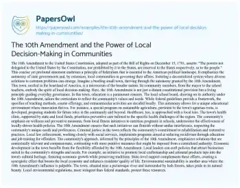 This essay is about the 10th Amendment to the United States Constitution and its impact on local decision-making in communities. It explores how the amendment reserves powers not explicitly granted to the federal government to the states or the people, promoting a decentralized system of governance. The essay illustrates this principle through a fictional town, highlighting its effects on education, healthcare, criminal justice, economic development, and environmental sustainability. By allowing local autonomy, the 10th Amendment fosters tailored solutions to community-specific challenges. The essay also discusses the balance between state and federal powers and the ongoing relevance of the 10th Amendment in contemporary political debates.