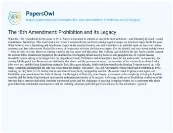 This essay about the 18th Amendment explores the ambitious yet ultimately unsuccessful attempt to enforce Prohibition in the United States from 1919 to 1933. It highlights the initial motivations behind the amendment, driven by a temperance movement that aimed to eradicate alcohol-related societal issues. However, the enforcement proved to be problematic, leading to the rise of speakeasies, bootlegging, and organized crime, with figures like Al Capone capitalizing on the ban. The economic impact was also significant, with job losses and a decrease in tax revenue. Public opinion shifted against Prohibition, culminating in its repeal by the 21st Amendment. The essay reflects on the complexities of legislating morality and the balance between individual freedoms and societal goals, presenting Prohibition as a cautionary tale about the limits of government intervention in personal choices. Also at PapersOwl you can find more free essay examples related to Legacy.