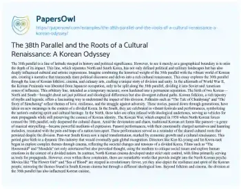 The 38th Parallel and the Roots of a Cultural Renaissance: A Korean Odyssey. (2024, Jun 17). Retrieved from https://hub.papersowl.com/examples/the-38th-parallel-and-the-roots-of-a-cultural-renaissance-a-korean-odyssey/