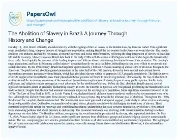 The Abolition of Slavery in Brazil: A Journey Through History and Change. (2024, May 28). Retrieved from https://hub.papersowl.com/examples/the-abolition-of-slavery-in-brazil-a-journey-through-history-and-change/