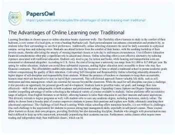 The Advantages of Online Learning over Traditional. (2021, Oct 14). Retrieved from https://hub.papersowl.com/examples/the-advantages-of-online-learning-over-traditional/