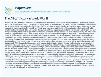 The Allies’ Victory in World War II. (2019, Mar 17). Retrieved from https://hub.papersowl.com/examples/the-allied-powers-in-world-war-ii/