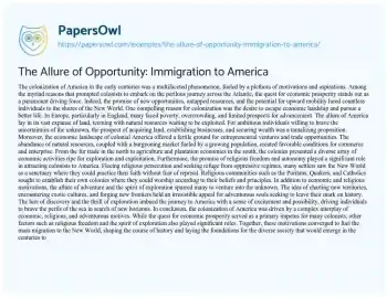 This essay about the colonization of America explores the primary reason colonists sought out the New World: economic opportunity. It highlights how the promise of land, resources, and commerce enticed individuals to escape hardship in Europe and seek prosperity across the Atlantic. Additionally, it touches upon the role of religious freedom and the adventurous spirit in driving colonization. Ultimately, the essay underscores how these motivations intertwined to shape the course of history, leading to the establishment of diverse colonies and the formation of modern American society. Moreover, at PapersOwl, there are additional free essay samples connected to Immigration.