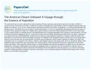 The American Dream Unboxed: A Voyage through the Essence of Aspiration. (2024, Mar 01). Retrieved from https://hub.papersowl.com/examples/the-american-dream-unboxed-a-voyage-through-the-essence-of-aspiration/