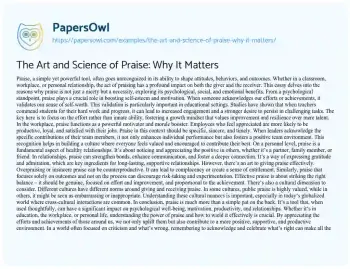 This essay explores the significance and impact of praise across various aspects of life, including educational settings, workplaces, and personal relationships. It highlights the psychological benefits of praise, such as boosting self-esteem and motivation, especially when it is focused on effort rather than innate ability. The essay emphasizes the role of praise in the workplace as a motivator and morale booster, pointing out that specific and sincere recognition can enhance productivity and foster a positive team environment. Additionally, it discusses the importance of praise in personal relationships, where it strengthens bonds and fosters communication and connection. The essay also addresses the nuances of giving effective praise, cautioning against overpraising or insincere compliments, and the cultural dimensions of praise. Concluding on the note that praise, when used thoughtfully, can uplift individuals and contribute to a supportive and productive environment, the essay underscores the transformative power of acknowledging and celebrating positive efforts and achievements in various spheres of life. You can also find more related free essay samples at PapersOwl about Science
