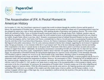 The Assassination of JFK: A Pivotal Moment in American History. (2024, May 21). Retrieved from https://hub.papersowl.com/examples/the-assassination-of-jfk-a-pivotal-moment-in-american-history/