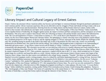 Literary Impact and Cultural Legacy of Ernest Gaines. (2019, Jan 26). Retrieved from https://hub.papersowl.com/examples/the-autobiography-of-miss-jane-pittman-by-ernest-james-gaines/