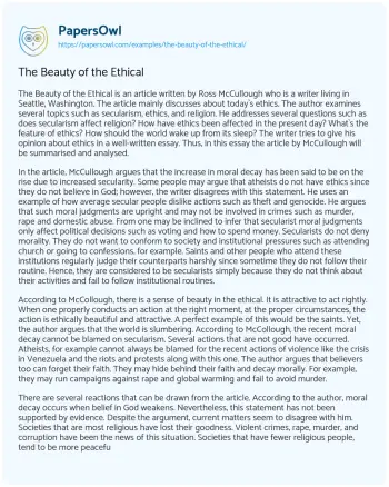 "The Beauty of the Ethical" is an article written by Ross McCullough, a writer based in Seattle, Washington. The article primarily discusses the state of ethics today. The author examines several topics, including secularism, ethics, and religion. He addresses numerous questions: How does secularism affect religion? How have ethics been impacted in the present day? What is the future of ethics? How can the world awaken from its moral slumber? The writer attempts to present his views on ethics through a well-structured essay.