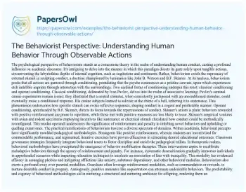 This essay is about the behaviorist perspective in psychology, which focuses on observable behaviors rather than internal mental states. It explains how behaviorism, through classical and operant conditioning, demonstrates that behaviors are learned through interactions with the environment. The essay highlights the contributions of key figures like Ivan Pavlov and B.F. Skinner and discusses the practical applications of behaviorism in education, therapy, and parenting. Despite criticisms for neglecting internal mental processes, behaviorism remains influential in understanding and modifying behavior, providing practical solutions to real-world problems.