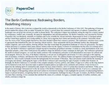 This essay scrutinizes the pivotal Berlin Conference of 1884-1885, an event that profoundly reshaped Africa’s geopolitical landscape during the “Scramble for Africa.” It highlights the conference’s role in formalizing European colonization, emphasizing how it arbitrarily redrew African borders without regard for the continent’s diverse cultural and social fabric. The piece delves into the conference’s broader implications, underscoring its reflection of the imperialist mindset of the era and its lasting impact on Africa’s political and social dynamics. Furthermore, the essay recognizes the resilience and resistance of African nations, framing the conference’s legacy as both a symbol of colonial domination and a catalyst for subsequent movements of liberation and self-determination. The Berlin Conference is presented not just as a historical event, but as a stark reminder of the consequences of disregarding cultural integrity in international relations and the enduring influence of historical decisions on present-day challenges. At PapersOwl too, you can discover numerous free essay illustrations related to History.