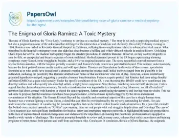 This engaging essay delves into the perplexing and mysterious case of Gloria Ramirez, famously known as the “Toxic Lady.” On a February night in 1994, Ramirez, suffering from advanced cervical cancer, was admitted to a California hospital and triggered an extraordinary medical crisis. As she received treatment, a bizarre phenomenon occurred: hospital staff began experiencing severe symptoms, fainting, and feeling ill, leading to a partial evacuation of the emergency room. The essay explores the whirlwind of theories that emerged to explain this strange event, from chemical reactions related to Ramirez’s use of a home remedy to suggestions of mass hysteria. It critically examines the forensic theories and the skepticism surrounding them, highlighting the complexity and ambiguity of the case. Beyond the scientific and conspiratorial speculations, the essay emphasizes the human aspect of this story, reminding us of the personal tragedy of Ramirez amidst the sensationalized mystery. The case not only remains a captivating medical enigma but also led to significant changes in hospital safety protocols, underscoring its lasting impact on healthcare practices. The story of Gloria Ramirez is presented as a blend of intrigue, science, and the unresolved, making it a fascinating chapter in medical history. At PapersOwl, you’ll also come across free essay samples that pertain to Mystery.