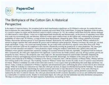 The Birthplace of the Cotton Gin: A Historical Perspective. (2024, May 21). Retrieved from https://hub.papersowl.com/examples/the-birthplace-of-the-cotton-gin-a-historical-perspective/