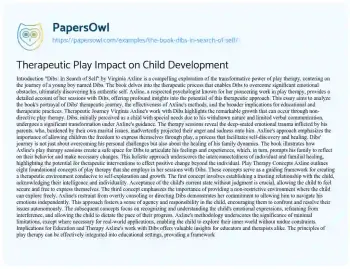 This essay will provide an analysis of Virginia M. Axline’s book “Dibs: In Search of Self.” It will discuss the book’s portrayal of child therapy, the psychological development of the child protagonist, and its contributions to the understanding of child psychology and therapy. Moreover, at PapersOwl, there are additional free essay samples connected to Book.