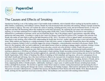 Smoking is one of the leading causes of preventable death worldwide, with its harmful effects reaching far beyond the smoker to affect families, communities, and healthcare systems. Despite the well-documented risks associated with smoking, millions of people around the globe continue to light up. This essay will examine the causes of smoking, including personal, social, and environmental factors, as well as the long-term and often life-threatening effects that smoking has on the body and society. By exploring the root causes and consequences of smoking, we can better understand how to address this ongoing public health issue.