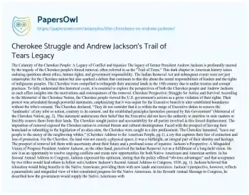 Cherokee Struggle and Andrew Jackson’s Trail of Tears Legacy. (2021, Mar 16). Retrieved from https://hub.papersowl.com/examples/the-cherokees-vs-andrew-jackson/