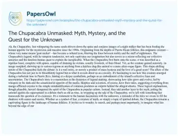 The Chupacabra Unmasked: Myth, Mystery, and the Quest for the Unknown. (2024, Feb 20). Retrieved from https://hub.papersowl.com/examples/the-chupacabra-unmasked-myth-mystery-and-the-quest-for-the-unknown/