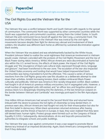 The Civil Rights Era and the Vietnam War for the USA. (2020, Mar 15). Retrieved from https://hub.papersowl.com/examples/the-civil-rights-era-and-the-vietnam-war-for-the-usa/
