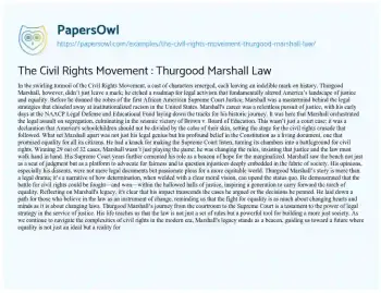 The Civil Rights Movement : Thurgood Marshall Law. (2024, Apr 14). Retrieved from https://hub.papersowl.com/examples/the-civil-rights-movement-thurgood-marshall-law/