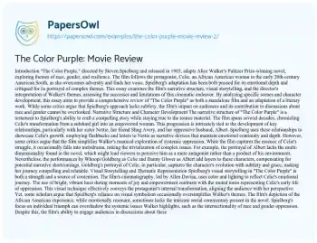 By analyzing specific scenes and character development, this essay aims to provide a comprehensive review of "The Color Purple" as both a standalone film and an adaptation of a literary work. While some critics argue that Spielberg's approach lacks subtlety, the film's impact on audiences and its contribution to discussions about race and gender cannot be overlooked.
