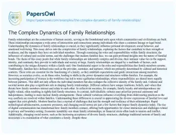 Through examining the roles and responsibilities within family structures, the influences of cultural and societal norms, and the challenges that modern families face, we can gain profound insights into the nature of familial bonds. The thesis of this essay posits that while family relationships are inherently complex and diverse, their intrinsic value lies in the support, identity, and continuity they provide to individuals and society at large.