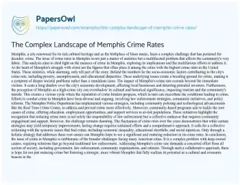 This essay about the crime rate in Memphis examines the complex factors contributing to the city’s high crime statistics and the broad impact on its community and economic development. It discusses the socio-economic conditions, such as poverty and educational disparities, that underlie the crime rate, suggesting these issues as the root causes that need addressing. The essay also covers the diverse efforts to combat crime, including law enforcement strategies and community initiatives aimed at tackling these foundational problems. It emphasizes that lasting change requires a holistic and sustained approach, involving all sectors of society. The challenge of reducing crime in Memphis is presented not just as a matter of law enforcement but as a collective endeavor that demands comprehensive solutions to systemic issues.
