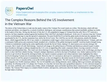 The Complex Reasons Behind the US Involvement in the Vietnam War. (2024, Mar 25). Retrieved from https://hub.papersowl.com/examples/the-complex-reasons-behind-the-us-involvement-in-the-vietnam-war/