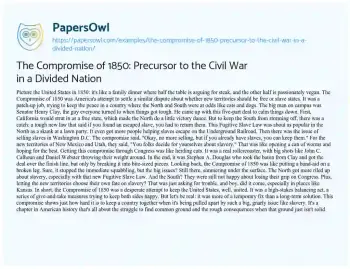 The Compromise of 1850: Precursor to the Civil War in a Divided Nation. (2024, Feb 01). Retrieved from https://hub.papersowl.com/examples/the-compromise-of-1850-precursor-to-the-civil-war-in-a-divided-nation/