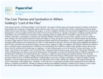 The Core Themes and Symbolism in William Golding's "Lord of the Flies". (2024, May 21). Retrieved from https://hub.papersowl.com/examples/the-core-themes-and-symbolism-in-william-goldings-lord-of-the-flies/