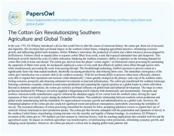The Cotton Gin: Revolutionizing Southern Agriculture and Global Trade. (2024, Jun 17). Retrieved from https://hub.papersowl.com/examples/the-cotton-gin-revolutionizing-southern-agriculture-and-global-trade/