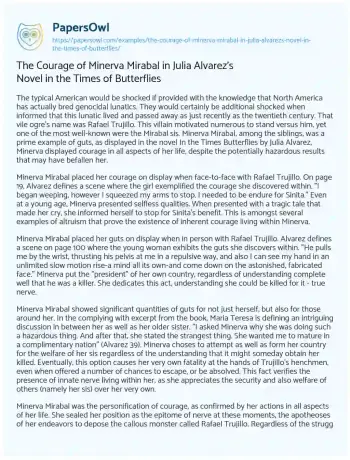 The Courage of Minerva Mirabal in Julia Alvarez's Novel in the Times of Butterflies. (2022, Dec 16). Retrieved from https://hub.papersowl.com/examples/the-courage-of-minerva-mirabal-in-julia-alvarezs-novel-in-the-times-of-butterflies/