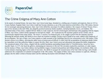 Delve into the chilling narrative of “The Crime Enigma of Mary Ann Cotton.” This essay unravels the mysterious tale of a 19th-century serial killer who defied expectations. Mary Ann Cotton, seemingly unassuming, embarked on a calculated spree of poisoning her family members for financial gain. Employing arsenic and leaving a trail of death across two decades, Cotton’s crimes posed a formidable challenge to 19th-century law enforcement. The essay navigates the complexities of her case, exploring the lack of forensic science at the time and the sensationalism surrounding her arrest and trial. Mary Ann Cotton’s legacy endures as a haunting reminder of the dark corners of human nature and the enduring fascination with individuals who defy societal norms. Moreover, at PapersOwl, there are additional free essay samples connected to Crime.