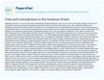 Opportunity knocks on America's door where determination holds the golden key. However, the reality of this ideal is fraught with crises and contradictions that reveal deep-seated inequities, particularly within the American educational system. These disparities often prevent individuals, especially those from minority communities, from accessing the resources and opportunities necessary to realize their potential. In exploring these issues, we find that the American Dream is not accessible to all, due largely to the structural barriers present in education, family dynamics, and community support systems.