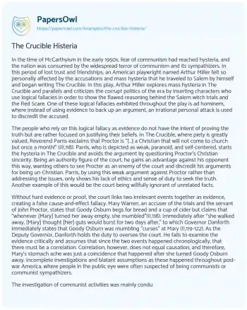 In the time of McCarthyism in the early 1950s, fear of communism had reached hysteria, and the nation was consumed by the widespread terror of communism and its sympathizers. In this period of lost trust and friendships, an American playwright named Arthur Miller felt so personally affected by the accusations and mass hysteria that he traveled to Salem by himself and began writing The Crucible. In this play, Arthur Miller explores mass hysteria in The Crucible and parallels and criticizes the corrupt politics of the era by inserting characters who use logical fallacies in order to show the flawed reasoning behind the Salem witch trials and the Red Scare.