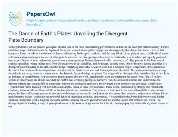 Embark on a geological odyssey with “The Dance of Earth’s Plates: Unveiling the Divergent Plate Boundary.” This essay unveils the mesmerizing choreography beneath our oceans, where tectonic plates engage in a subtle yet profound dance of separation. Explore the iconic Mid-Atlantic Ridge as the stage for this geological performance, witnessing the creation of new oceanic crust and the widening of ocean floors. Beyond the spectacle, delve into the ecological significance of divergent plate boundaries, where hydrothermal vents give rise to thriving ecosystems in the deep sea. Join this narrative that uncovers the delicate balance and dynamic forces shaping our planet, hidden beneath the waves and contributing to the ever-evolving story of Earth. More free essay examples are accessible at PapersOwl about Earth.