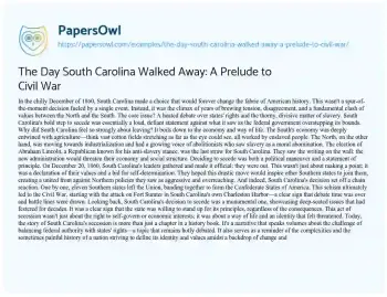 The Day South Carolina Walked Away: A Prelude to Civil War. (2024, Feb 20). Retrieved from https://hub.papersowl.com/examples/the-day-south-carolina-walked-away-a-prelude-to-civil-war/