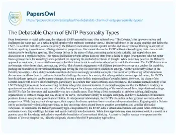 In professional settings, the debater personality excels in roles that demand strategic thinking, problem-solving, and creative brainstorming. However, their spontaneity and preference for exploration over structure may lead to occasional challenges in more rigid or detail-oriented environments. Overall, the debater personality type brings a dynamic and intellectually vibrant energy to discussions and endeavors, contributing a unique perspective to the diverse landscape of human personalities. You can also find more related free essay samples at PapersOwl about Personality.