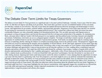 This essay is about the debate over term limits for Texas governors. It discusses the arguments for and against term limits, highlighting the potential benefits of preventing power concentration and encouraging political renewal, as well as the risks of corruption. On the other side, it examines the value of experience and continuity in leadership and argues that democratic elections serve as a natural check on power. The essay also considers the historical context of Texas governance and the impact of term limits on policy development and implementation. The ongoing debate reflects broader questions about governance, democracy, and effective leadership.