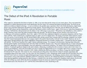 The Debut of the iPod: A Revolution in Portable Music. (2024, Jun 17). Retrieved from https://hub.papersowl.com/examples/the-debut-of-the-ipod-a-revolution-in-portable-music/